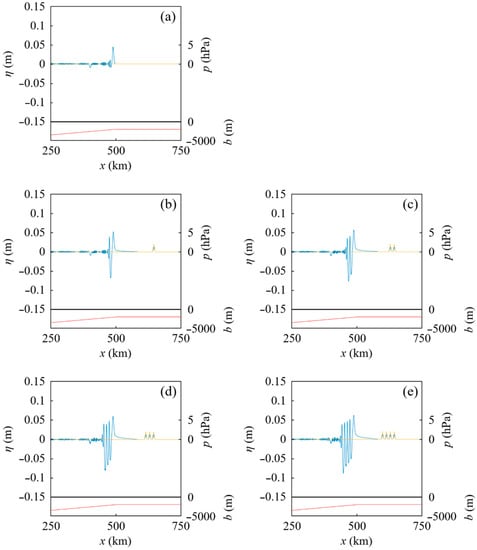 When the atmospheric pressure waves as illustrated in Figure 1—in which x1 is 55 km and the interval δ is 5 km—pass the existing tsunami TLamb, the water surface profiles at t = 2380 s are presented in Figure 4. In the cases of Figure 4b–e, the existing tsunami TLamb was passed by one, two, three, and four atmospheric pressure waves, respectively. Conversely, in the case of Figure 4a, the tsunami TLamb propagated without any atmospheric pressure wave.