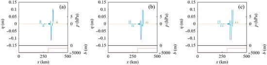 For comparison, in Case G, the same atmospheric pressure wave W1 as that in Case F existed and traveled at x ≤ 500 km over a flat seabed. The conditions of Case G are described in Table 1. The water surface profiles at t = 2100 s in Case G are depicted in Figure 9a–c, where the still-water depths are 5000 m, 3500 m, and 2000 m, respectively.
