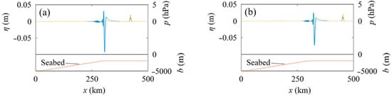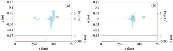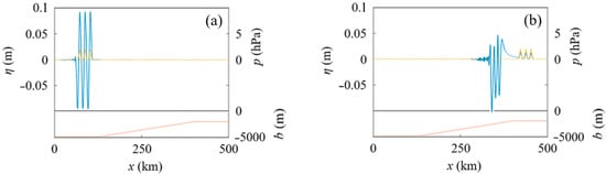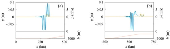 Water surface profiles in Case I, where x1 = 55 km and δ = 5 km in Figure 1; hon = 2000 m, xslope = 320 km, xon = 600 km, and the slope gradient β = 1.07 × 10−2 in Figure 2b. The blue, orange, and red lines indicate the water surface displacement η, atmospheric pressure p, and seabed position b, respectively. (a) t = 1190 s. (b) t = 2380 s.
