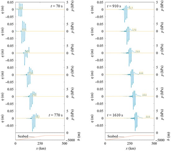 Time variation of the water surface profile every 140 s in 70 s ≤ t ≤ 1610 s in Case F, in which x1 = 55 km and δ = 5 km in Figure 1; hon = 2000 m, xslope = 20 km, xon = 300 km, and the slope gradient β = 1.07 × 10−2 in Figure 2b. The blue, orange, and red lines indicate the water surface displacement η, atmospheric pressure p, and seabed position b, respectively.
