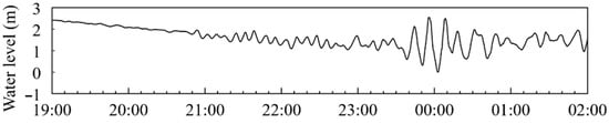 It should be noted that when the atmospheric pressure is negative, the water surface profiles are approximately upside down from the above cases. When an atmospheric pressure wave profile is an inverted isosceles triangle with a minimum pressure of −2 hPa and the other conditions are the same as those in Figure 10b, the maximum water level of the first free crest was 0.073 m and the minimum water level of the first free trough was −0.010 m at t = 1610 s.
