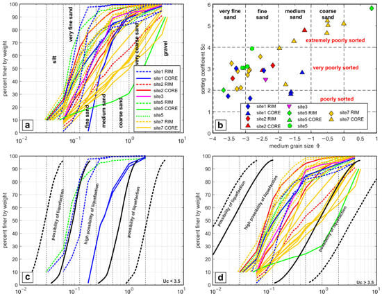 The grain size curves are shown in Figure 2a. Most profiles have an upward convex shape; others show linear or downward convex curves. All the curves indicate that these deposits are characterized by dominant granular particles in the range of sands. Figure 2b shows the scatter plot of median grain size, Φ (log2(D50)) vs. the sorting coefficient, Sc. According to the classification of [], 61% of median grain sizes fall in the range of very fine to fine sands. The sorting coefficient is classified according to []. The samples are dominantly very poorly sorted (71%), and only some COPIN (site 1) samples are poorly sorted (13%; Figure 2b). In particular, we observed that overall, the sands sampled in the dike rims are finer and relatively more sorted compared to the cores. To investigate if the grain size curves fall in the liquefaction probability field [], we divided the grain-size curve according to their uniformity coefficient; the first group is characterized by a Uc < 3.5 (Figure 2c) and the second by a Uc > 3.5 (Figure 2d). The majority of the grain size curves have a Uc > 3.5, and only five samples of COPIN and one of the Gauro (site 5) show a Uc < 3.5.