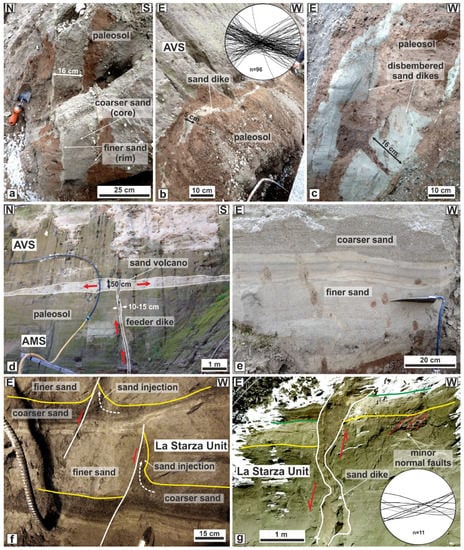 COPIN area (site 1). (a,b) Sand dike within the paleosol covering the AMS deposits and stereographic projection of dike boundaries. (c) Dismembered sand dike. (d) Sand volcano with feeding dike. (e) A section of the sand volcano flank. (f) Sand injections in the footwall of normal faults. (g) Hybrid normal fault with sand injection and stereographic projection of fault planes.