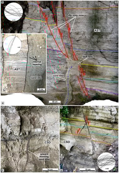 The sand dike located in site 2 is hosted in the AST succession (Figure 3a). It is genetically related to the normal fault zone; in fact, it is orthogonal to the fault planes and intrudes within the fault zone lens (Figure 3a), probably due to the more intense fracturing of this sediment volume. The sand injection does not continue upward in the hanging wall, suggesting it migrated horizontally following the E-W-directed relay zone. Therefore, the liquefaction episode that caused the sand injection is subsequent to the faulting. The E-W faults are widespread in the whole central sector of the CF caldera [,] and are thought to be associated with the ground deformation of the Epoch 3b and the one the last eruption of Monte Nuovo at 1538 CE. It follows that the sand injection probably occurred triggered by a liquefaction process associated with the intense seismic activity anticipating the eruption []. The sand injections of site 3 (Figure 1) occur as single dikes with a tip tapering upward (Figure 3c) or as injections in the footwall of conjugate normal faults (Figure 3d) that clearly indicate an upward flow. A similar interpretation can be proposed for the dikes in the La Pietra outcrop (site 4), where sand injections are associated with faulting (Figure 4a). These structures are located in the hanging wall of a major normal fault that lowered the Epoch 3’s successions with respect to the La Pietra lithosome (14 ka; []) toward the Agnano caldera, located to the North.