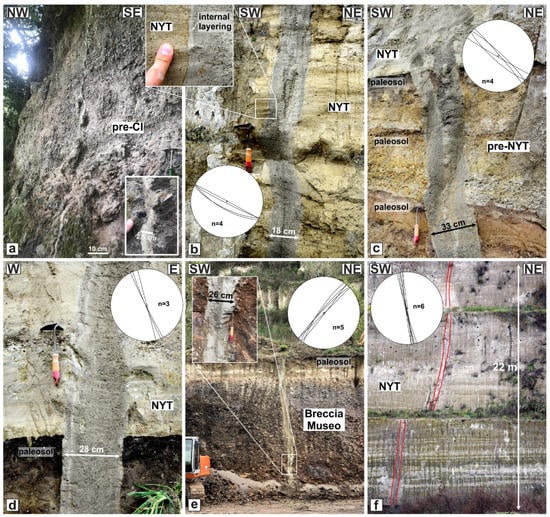 Punta Marmolite (site 6): (a) sand dike within the breccia deposit of the Punta Marmolite lava dome. Zaccaria quarry (site 7): (b–d) sand dikes within the pre-NYT and NYT tephra layers; (e) sand dike cross-cutting the Breccia Museo Unit of the Campanian Ignimbrite deposit; (f) sand dike hosted in the NYT with a length larger than 22 m. Stereographic projections of dike boundaries are shown in (b–f).