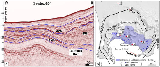 (a) Interpreted seismic profile within the Pozzuoli Gulf (after [] modified). (b) Reconstruction of the La Starza sediment distribution (after [] modified). AMS: Agnano–Monte Spina; PU: Pozzuoli Unit; AVS: Averno-Solfatara.