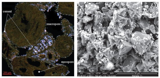 Natural lithotype B2: (a) Thin section; (b) Environmental scanning electron microscopy image.