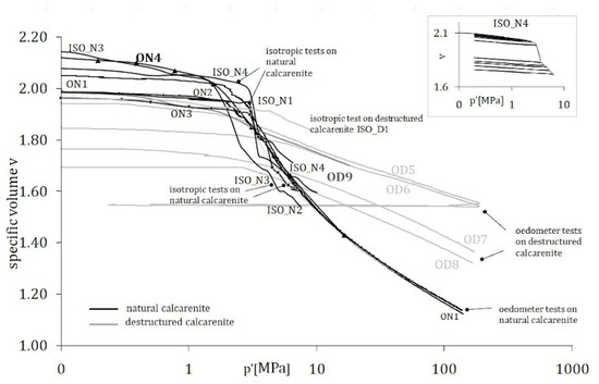 A direct comparison between oedometer compression and isotropic compression curves is shown in Figure 3. A value of K0 (i.e., coefficient of earth pressure at rest) equal to 0.5 was assumed in order to compare compression paths in the v vs. log p’ plane. This value may result in overestimation for the cemented natural samples [12]; however, a change in its estimation does not influence the shape of the curve significantly because of the log p’ scale and because a change of K0 only shifts the compression curve in this plane. The conclusion on the higher stiffness of the destructured samples will be not affected by this. As for the isotropic compression curves, the typical gross yield can be recognised in all natural samples [19], while very mild curvature and no abrupt yield can be seen for the compression path of the one and only specimen that was destructured by tamping and hammering, ISO_D1. It seems that the initial state (natural or destructured) controls the compression behaviour. This can be confirmed by observing the test ISO_N4 which behaves like natural samples even if the structure was modified (i.e., destructured) by means of loading and unloading paths during the test. Hence, the destructuration process carried out by the other method (tamping and gentle hammering) before the test during sample preparation before is a completely different phenomenon if compared to the destructuration occurring during natural sample compression in the triaxial cell. Data have then been compared to the oedometer test curves.