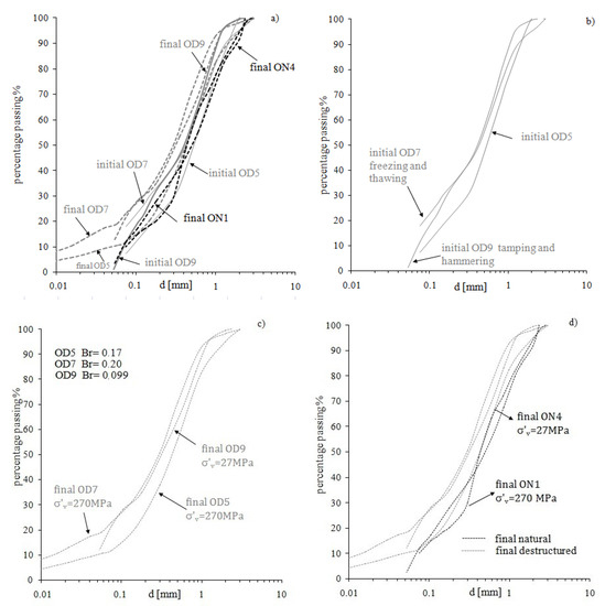 Figure 4c isolates the effect of stress level for the destructured samples also showing values of relative breakage Br [21]. Within the scatter that occurs in such heterogeneous materials, there would appear to be no evident influence of the destructuration method but only of the vertical stress. Comparing the final gradings of the natural samples with those of the destructured ones in Figure 4d, large amounts of fines seem not to be created in the natural samples despite the extremely high vertical stresses reached.