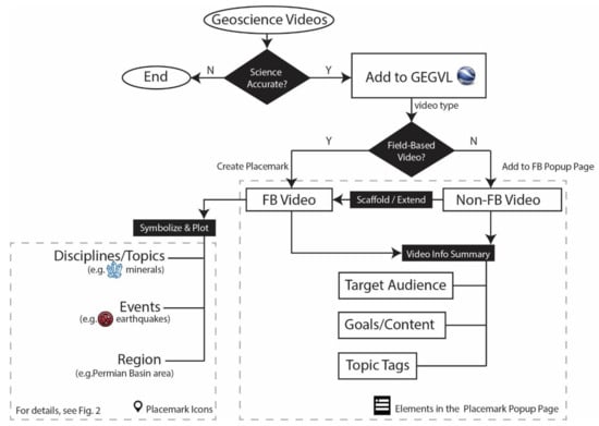 Overall, the creation of GEGVL includes four major parts: (1) identifying geoscientific videos with useful, accurate content; (2) classifying these into field-based (FB) and non-field-based (non-FB) videos; (3) locating FB videos using Google Earth; and (4) providing links to pertinent non-FB videos as part of FB video links. GEGVL classifies videos into FB videos and non-FB videos. FB video contents pertain to a specific location or region that can be shown on Google Earth, e.g., Geo News videos [], while the contents of non-FB videos are more abstract, not pertaining to any particular region (e.g., what is plate tectonics theory?). By locating FB videos on the virtual Earth and linking pertinent non-FB videos to these, we try to better engage and steer students to learn more about Earth science and scaffold their learning. This structure has the potential to organize all geoscience videos because all of these are either field-based or non-field-based. In this way, we provide users a virtual field trip experience that allows them freely explore Earth science-related concrete objects and events and connect these to more abstract concepts and processes. It is straightforward for users to start exploring all kinds of geoscience videos based on their personal interests in places, topics, or events. Thus, GEGVL is also rooted in virtual outdoor education and active learning strategies.