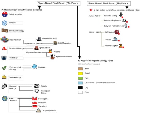 The FB videos in GEGVL are assigned to one of ten different geoscience disciplines: Plate Tectonics, Minerals, Structural Geology, Metamorphism, Magmatism, Hydrology, Environmental Science, Sedimentology, Paleontology, and Paleomagnetism. The fundamental components of GEGVL are field-based videos that focus on observable objects or experientable events. Many of these are familiar and relevant to people, with or without Earth science education (e.g., minerals or an earthquake). Videos present FB events and objects virtually and build on this interest to allow geoscientists to explain more abstract science concepts related to these to the engaged audience. We highlighted FB videos because people learn better when context is provided [,,,]. GEGVL builds on this to create a natural learning experience to motivate people to actively learn more at their pace in their own ways []. That is why GEGVL also provides non-FB videos to support their learning. Many geoscientific educational (GeoEd) videos are not about field-based events or objects but present abstract geoscientific concepts. Based on how the Earth system works, these non-FB videos are linked with the FB videos, in an effort to support students’ understanding. The basic logic is to (1) start with what people know, are interested in, and are familiar with, to engage them to want to learn more geoscience; (2) give teachers and students an opportunity to explore various Earth events over various scales of time and space; and (3) allow teachers and learners to roam the Earth to freely choose what to learn. This approach can also help diverse groups with different backgrounds, interests, and geoscientific knowledge. As of April 2022, GEGVL contains 150 videos covering the ten different geoscience disciplines. We created discipline- and events-representing icons for placemarks on Google Earth, which leads to selected FB and non-FB videos.