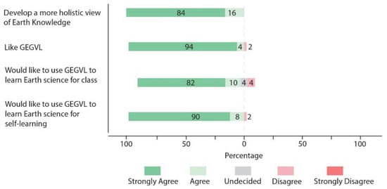 Responses to the experience of using GEGVL from surveyed students and teachers were, overall, positive. GEGVL was mostly liked by the surveyed students (N = 71) who want to use it in class and self-learn some Earth science topics. All students in our survey agreed that the GEGVL helped them develop a more holistic view of Earth science knowledge (63 strongly agree, 8 agree). In total, 70 students liked the GEGVL (68 strongly agreed and 2 agreed), and only 1 student did not (Figure 4). These results show that most students considered GEGVL a good tool for both classes and self-learning. However, more students believed GEGVL is better for self-learning purposes (90% versus 82% strongly agree).