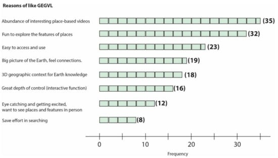 A detailed summary chart for the reasons why surveyed students like the GEGVL is shown in Figure 5. Some comments from surveyed students about the GEGVL include the following statements: “The video library does give a good ability to tie understanding of location and area to specific info.”; “The benefit is the knowledge of science on the world, right from your home or location.”; “It’s awesome, lots of information about all places. It needs a simpler guide though.”; “I like that it is interactive and informative.”; “I think it is easily accessible.”; “It could make for a more enjoyable learning experience immersing into new forms of learning.”; “It is amazing since it has icons on the map which when clicked on moves to a video explanation of what happened in that particular place. There are also additional interesting facts, geological terms, etc., which makes learning more fun.”; “This is an amazing initiative, as it makes the learning of geographical elements more realistic. It explains the concepts in a lively way.” The most mentioned liked factors include (1) abundance of FB videos (mentioned 35 times), (2) exploration of geographic features (32 times), (3) easy to use (23 times), (4) big picture of Earth and feel the connections of things and events (19 times), and (5) geographic context for Earth science knowledge (18 times).