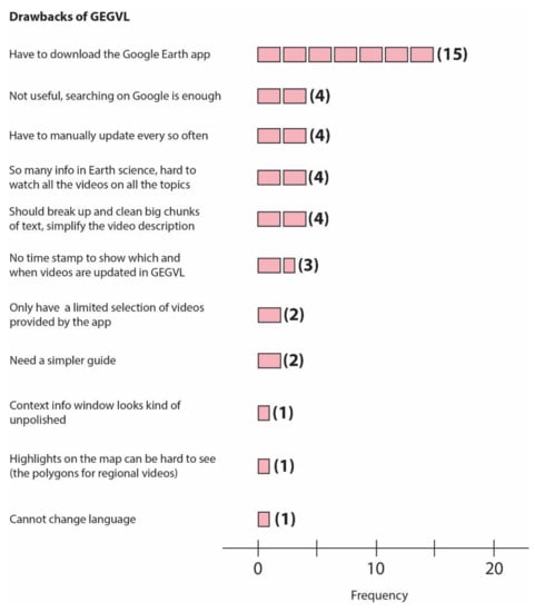Students also reported some drawbacks, such as “have to download the app” (mentioned 15 times); “The details that are given as highlights on the map rather than icons can be hard to see, and an alternate method for seeing a list of all content in a browsable format would be helpful.”; and “There is so much information about Earth sciences out there that watching all the possible topic videos would be difficult.” There were some comments mentioned that GEGVL is unnecessary and no better than a Google search for the needed topics (Figure 6).