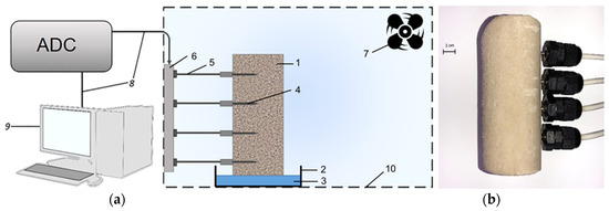 Sketch of Kriolab Tbf system (a) and picture of the frozen hydrate saturated sand sample with temperature sensors (b). 1 = frozen hydrate-saturated sediment; 2 = solution container; 3 = NaCl solution; 4 = temperature sensors; 5 = thermistor streamer; 6 = branch box; 7 = fan; 8 = USB cable; 9 = PC with Kriolab Tbf software; 10 = cooling chamber. Modified after [61].
