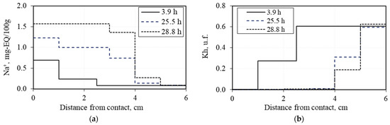 Changes of Na+ contents (a) and hydrate coefficient (b) in frozen hydrate-bearing sand (Khin = 0.6, W = 12%) for 3.9, 25.5, and 28.8 h of interaction with a 0.1 N NaCl solution at 0.1 MPa and −6 °C.