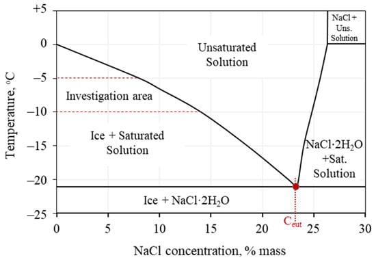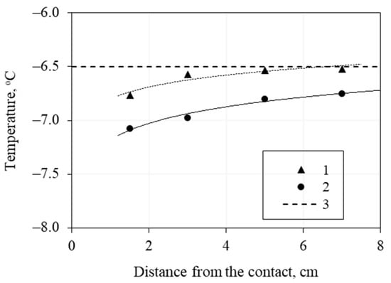 - The samples were juxtaposed against a frozen NaCl solution (saline ice) at a constant negative temperature (−6.5 ± 0.1 °C) and under atmospheric pressure (0.1 MPa), in a tight thermally insulated box. The interaction process was monitored continuously, with temperature sampling.