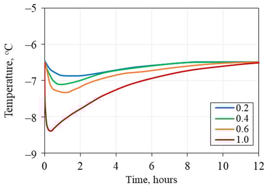 The cooling trend from −6.5 °C was also observed in the case of a more concentrated (1.0 N) NaCl solution (Figure 5). The hydrate-bearing sample became ~1.9 °C colder, but the time when it reached the minimum temperature (−8.3 °C) depended on the distance to the contact: after 20 min of interaction at 2.5 cm to the contact (1 sensor) and after 35 min at 7 cm. The onset of cooling likewise depended on the distance to the contact, while the cooling rate was within 0.08 to 0.1 deg/min.