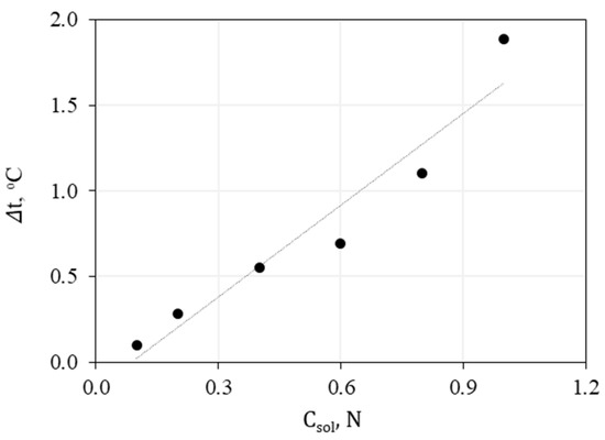 The patterns for the solutions of the different concentrations revealed temperature sensitivity to salinity (Figure 7). As the salt concentration increased from 0.1 to 1.0 N (Figure 7), cooling at 2.5 cm to the sample-solution contact became stronger (Δt from 0.3 °C to 1.9 °C) and faster (the sample reached the temperature minimum in 15 min instead of 1 h). The reason is that more concentrated solutions can cause more rapid dissociation of pore-gas hydrates. The temperature change Δt showed salinity dependence (Figure 8): the sample interacting with a 0.1 N NaCl solution became only 0.1 °C colder, but the cooling reached 2.0 °C in the case of a 1.0 N solution, i.e., Δt became 20 times greater as the salt concentration increased from 0.1 to 1.0 N.