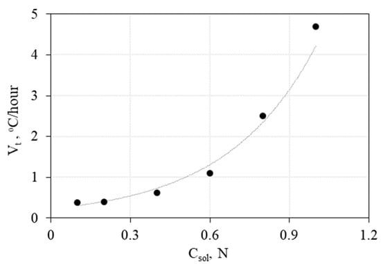 Note that the cooling rate (Vt, °C/h) likewise increased considerably with the salinity increase (Figure 9): from 0.4 °C/h for 0.1 N to 4.7 °C/h for 1.0 N, which is an increase of more than 10 times.