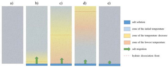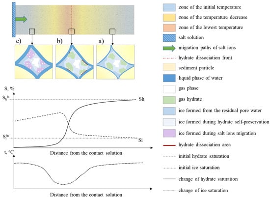 The changes caused by salt transport to frozen samples containing metastable pore-gas hydrates can be presented in a more detailed model (Figure 13). At some point, after the onset of the interaction with the NaCl solution and the related Na+ migration and accumulation, the samples develop a cooling zone produced by the dissociation of gas hydrates and the melting of ice in the pore space. In the hydrate-saturated samples, the initial (ambient) temperature and the initial contents of the pore ice and hydrates persist far from the contact, where dissolved salts have not penetrated yet. In these conditions, pore hydrates exist in the preserved state, and no phase transitions occur (Figure 13a).