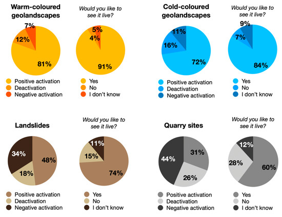 The images picturing landslides obtain a total of 47.68% of positive activations in users, 18.38% cases of deactivations, and 33.94% of negative activation. Nevertheless, 74.34% of compilers declared that they would like to see that geological landscape live, 15.15% do not want to, while 10.51% do not know.