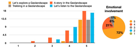 Figure 10 shows how, on a scale from 1 to 5, most of the users feel highly emotionally involved, and how the scores are distributed among the different modes of excursions. Differences are not detectable, as an emotional engagement is probably conveyed simply by spectacular geological landscapes, or the excitement of living experiences in nature, in groups, or in the first person.