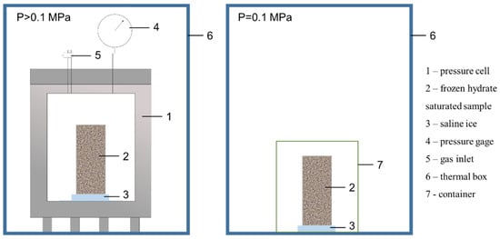 The frozen cylindrical twin samples (~5 cm in diameter and 6–9 cm high) initially containing 11–12% of water were saturated in the vacuumed tight pressure cell by filling it with cold hydrate-forming gas (99.98% CH4) up to the hydrate formation pressure > 3 MPa, under specially created conditions providing uniform saturation of the pore space []. Additionally, five or six samples with similar moisture contents, density and hydrate saturation were prepared in the same way and were used for comparison. Saturation of the samples in the pressure cell began at temperatures of −5 to −6 °C; gas hydrates formed immediately on the surface of porous ice, impeded migration of pore moisture, and became distributed uniformly over the samples. The saturation process was enhanced using cyclic temperature fluctuations from −5 or −6 °C to +3 °C. It lasted at least two weeks, and then the samples were frozen to −6 ± 1 °C. The residual liquid pore moisture that had not converted to hydrate froze up. Thus, obtained samples had hydrate saturation of at least 60% [].