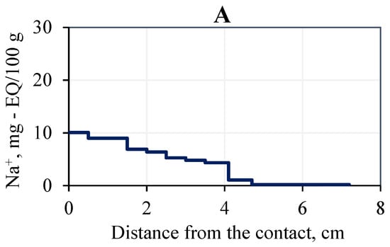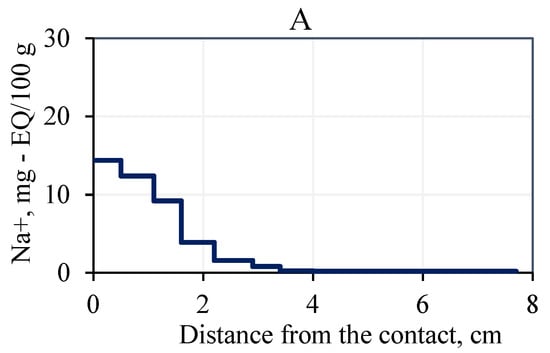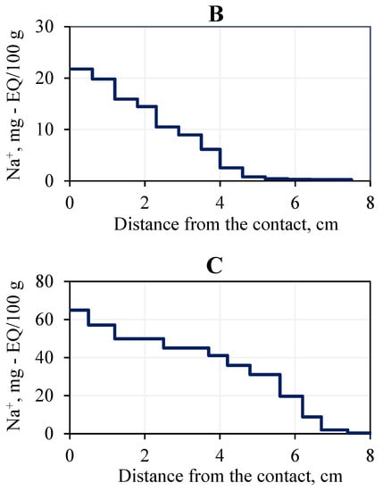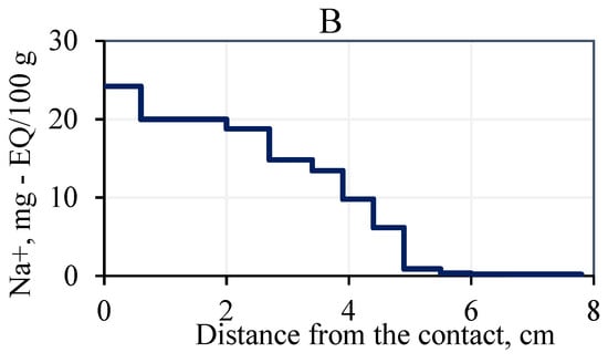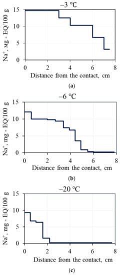 At the below-equilibrium pressure (0.1 MPa) and a constant temperature of −6.5 °C, Na+ penetrated farther into the samples as the source solutions became more saline: 4.5 cm, 5.2 cm, and 7 cm from the contact at NaCl concentrations of 0.1N (Figure 7A), 0.2 N (Figure 7B), and 0.4N (Figure 7C), respectively, after 4 h of interaction.