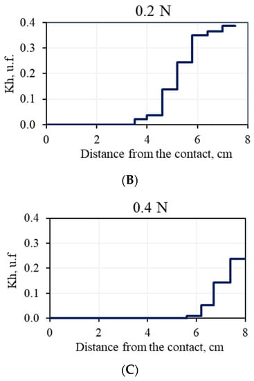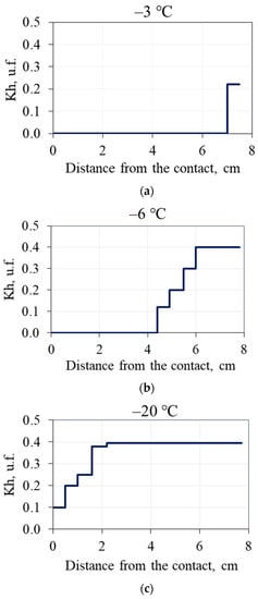 Variations of hydrate coefficient () along frozen hydrate-bearing sand samples (~0.4, W = 12%) for 2 h of interaction with a 0.2 N NaCl solution at −3 (a), −6 (b), and −20 °C (c).