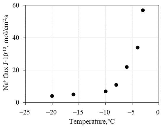 The calculated average Na+ flux density for the applied experimental conditions showed a decreasing trend at lower temperatures (Figure 4): it was 58.10−10 mol/cm2 at −3 °C, 20.10−10 mol/cm2 at −6 °C, and only 5.10−10 mol/cm2 at −20 °C (Figure 4).