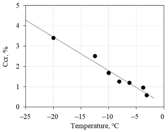 The critical salt concentration required for complete dissociation of metastable pore gas hydrates in a sample interacting with a 0.1 N NaCl solution at 0.1 MPa showed linear temperature dependence (Figure 5). was higher at lower ambient temperatures (Figure 5): 0.6% relative to pore moisture at −2.5 °C; 2.5% at −10 °C, and 3.4% at −16 °C and 0.1 MPa.