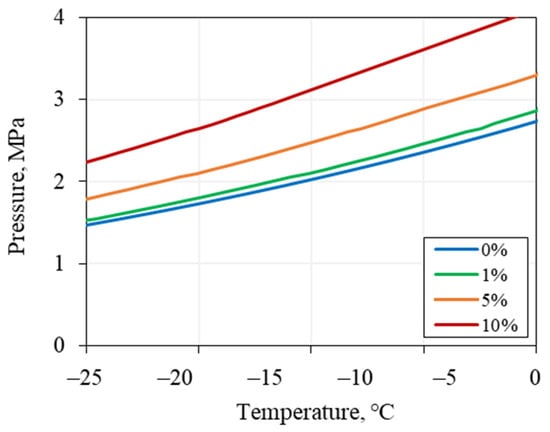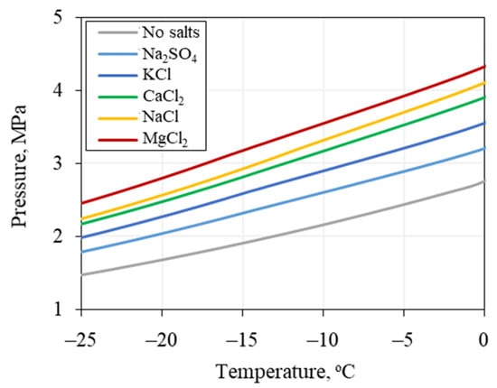The stability conditions showed to be highly sensitive to the salt composition. The equilibrium shifted to lower temperatures and pressures in the series Na2SO4–KCl–CaCl2–NaCl–MgCl2, for 5% solutions. The pressure shift relative to a non-saline gas–water system was 2.8 MPa for Na2SO4 and 3.8 MPa for MgCl2, at −5 °C (Figure 12). The modeling results are consistent with the available published data [,,].