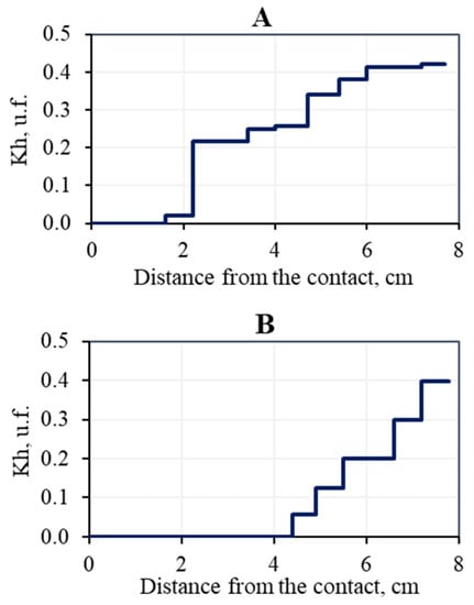 The contents of Na+ that migrated to the samples affect the distribution of gas hydrates (hydrate coefficient patterns). Hydrate constituted about 40% of pore moisture in the samples before the interaction with the NaCl solution and decreased progressively away from the contact after the interaction. After four hours of interaction at a constant temperature of −6.5 °C, the zone of decreasing hydrate coefficient expanded from 2.5 cm at 0.1 N to 5.6 cm at 0.4 N NaCl concentration (Figure 8) and covered the sample part where residual hydrate was present.