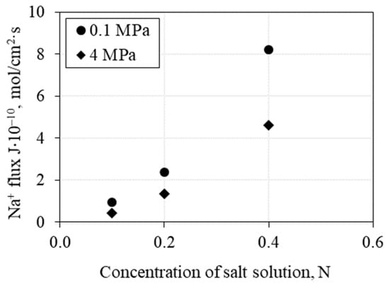 The NaCl concentration affected the average density of the Na+ flux to the frozen hydrate-bearing samples. It increased from 0.96·10−10 mol/cm2·s in the case of a 0.1 N solution to 8.2·10−10 mol/cm2·s upon interaction with a 0.4 N solution, at 0.1 MPa. A Na+ flux increase, though less prominent, was also observed in the 4.0 MPa runs: from 0.4 mol/cm2·s at 0.1 N to 4.62·10−10 mol/cm2·s at 0.4 N (Figure 11).