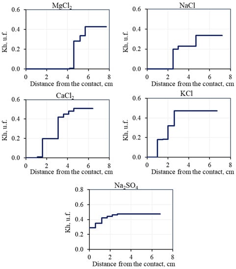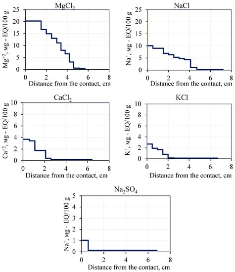 Salt ions penetrated the farthest (5 cm from the contact) into the sample that interacted with the MgCl2 solution. The respective values for other salts were 4.6 cm for NaCl, 2.8 cm for CaCl2, 2 cm for KCl, and only ~0.6 cm for Na2SO4.