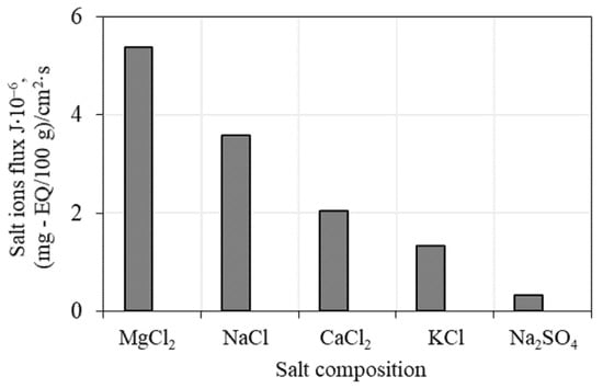 Average flux density of salt ions to the pores of frozen hydrate-bearing samples (Figure 15) was the greatest in the case of interaction with the MgCl2 solution (5.4·10−6 (mg-EQ/100 g)/cm2·s) and the lowest in the case of Na2SO4 (0.3·10−6 mg-EQ/100 g)/cm2·s).