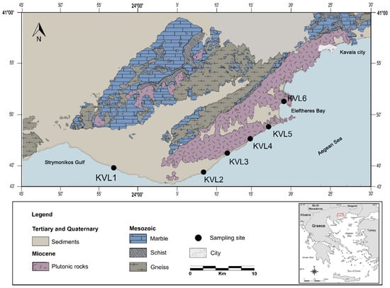 - Kromberg, P. Kavala Sheet. In Geological Map of Greece, Scale 1:50,000; Institute of Geology and Mineral Exploration (IGME): Athens, Greece, 1973. [Google Scholar]