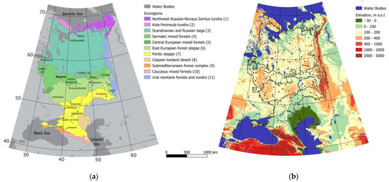 Map of the territory under study: (a) Ecoregions (Olson et al., 2001; Dinerstein et al., 2017) are shown by color filling and reference geographical objects are labelled; (b) Relief of the territory is shown by color filling, the meteorological stations are shown by dots, the ecoregions are delineated.