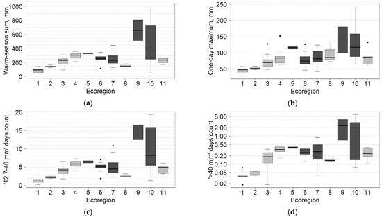 Precipitation regime of ecoregions: (a) histogram of mean sums of warm-season precipitation (Rwtot), mm. (b) histogram of the mean warm-season one-day maximum precipitation (R × 1 day), mm. (c) histogram of the mean number of days with daily precipitation from 12.7 to 40 (R12.7–40) mm. (d) histogram of the mean number of days with daily precipitation more than 40 mm (R40); vertical axis is logarithmic. Darkened boxes correspond to ecoregions with arable lands. Numeration of ecoregions corresponds to Figure 1.