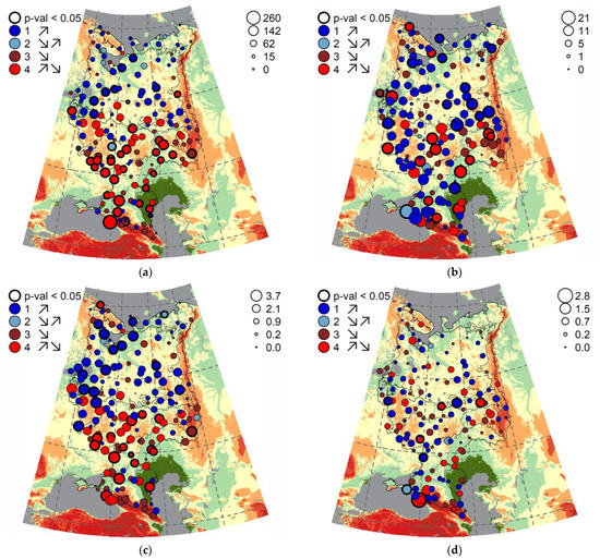 Maps of precipitation trends amplitude. The amplitude is estimated as the difference between the maximum and minimum expectations of the model during the period of 1966–2020. (a) the amplitude of the total precipitation of the warm season (Rwtot), mm; (b) the amplitude of the warm season one-day maximum (R × 1 day), mm; (c) the amplitude of the number of days with daily precipitation from 12.7 to 40 mm (R12.7–40), days; (d) the amplitude of the number of days with daily precipitation more than 40 mm (R40), days. Legend to the left of the figure: thicker outline of the circles corresponds to statistically significant trends; the color of the icon indicates the type of model that characterizes the time series of the erosion index. Legend to the right of the figure: the size of the icon is proportional to the magnitude of the change.