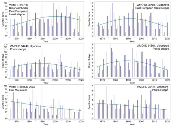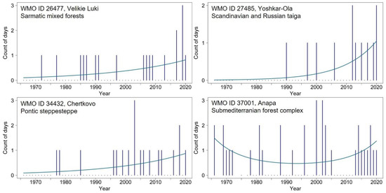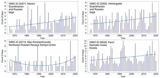 Examples of current growth trends in the number of days with precipitation from 12.7 to 40 mm (R12.7–40). The station number (WMO ID) is shown in the figures. The trend models are statistically significant at the 0.05 significance level.