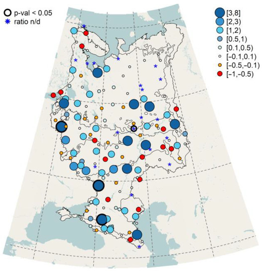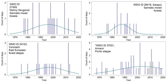 The identified trends estimate the expectation of the days with the most massive precipitation, but this expectation may be significantly less than the real number of days with observed extreme precipitation events. The trend direction of the expected number of days with a certain precipitation amount in most cases coincides with a similar direction of variance trend. However, some trends featured by a statistically significant model of monotonic increase or decrease have peak outliers in 1980–2000 (see several examples at Figure 5, station WMO ID 35026 Zilair; Figure 7, station WMO ID 22471 Mezen and WMO ID 22550 Arkhangelsk).
