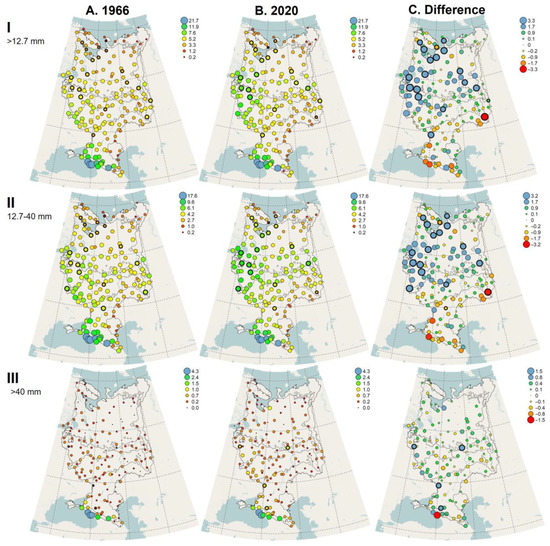Maps of the expectation of number of days with erosion-hazardous precipitation for 1966, 2020 and the difference in the number of showers in 2020 compared to 1966. The expectation of the number of days in 1966 and 2020 was estimated by regression models. Column (A): maps of the number of days with erosion-hazardous precipitation in 1966. Column (B): maps of the number of days with erosion-hazardous precipitation in 2020. Column (C): the difference in the number of days with erosion-hazardous precipitation in 2020 compared to 1966. The size and color of the circles reflect the amount of precipitation that falls during the warm season. The thickened outline of the circle corresponds to statistically significant monotonic trends, both rising and falling.