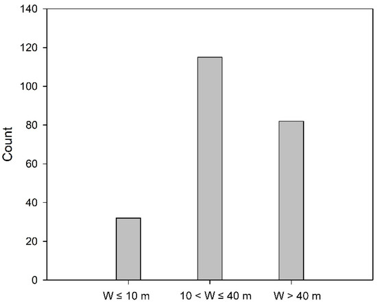 Frequency distribution of channel width in the data utilized to derive the predictive formulae of the longitudinal dispersion coefficient (Table S1).