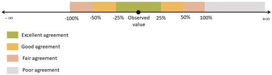 Level of agreement between modeled and observed parameters based on the relative percent error.