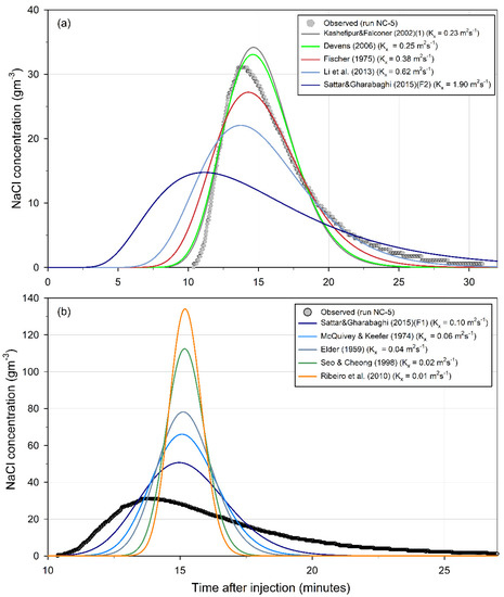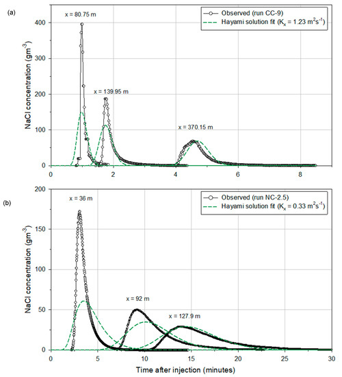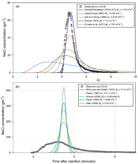 Even though Kx values were calculated for all of the 55 measured plumes, only a small subset was used to test the empirical formulae. The reason is that the theory for one-dimensional advection-dispersion assumes that complete channel-wide mixing and equilibrium has been attained. In practice, this is difficult to achieve with slug injections of tracer in natural systems, and there is a distance downstream of the injection site where advection dominates over dispersion (referred to as the ‘convective’ or ‘advective’ zone) [5,25]. The predicted length of the advective zone and its implications for the longitudinal dispersion coefficient calculation are addressed in more detail in Appendix A, where we also discuss the uncertainty associated with field measurements of dispersion in small channels.