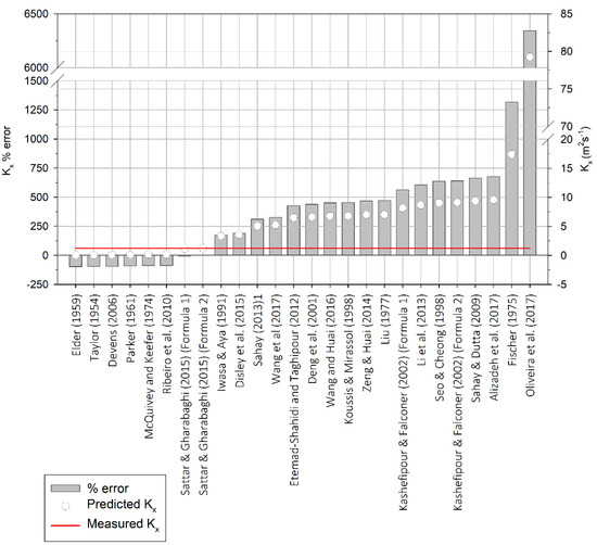 The majority (19 out of 26) of the formulae overestimated the value of the longitudinal dispersion coefficient in the concrete channel (Figure 8). The relative errors ranged from −100% (underestimation) to greater than 1000% (overestimation).