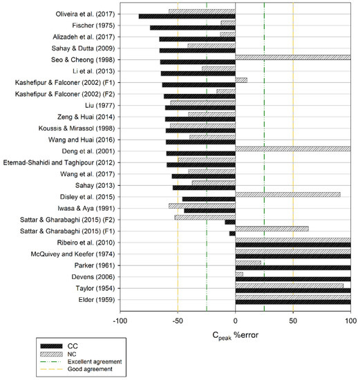 The formulae by Devens [11] and Kashefipour and Falconer (F1) [32] had the best performance (excellent agreement), with all four parameters predicted within 25% absolute error (Table 6). The formulae from Parker [10], Fischer [28], Alizadeh et al. [16], Kashefipour and Falconer (F2) [32], Li et al. [34], Sahay [35], Wang and Huai [19], and Wang et al. [17] were classified as having good agreement with the observed data. All the remaining formulae (16) were classified as having fair or poor agreement with the observed data, including the two formulae by Sattar and Gharabaghi [13], which performed best in the concrete channel.