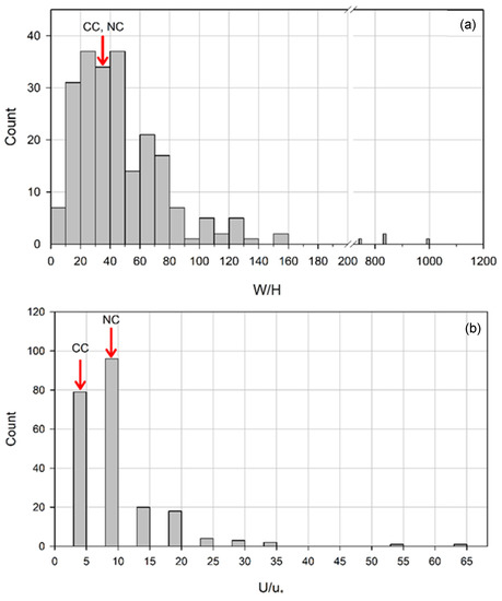 Frequency distribution of the data utilized to calibrate the empirical formulas for the longitudinal dispersion coefficient in Table 1. (a) W/H frequency distribution; (b) U/ frequency distribution. The red arrows indicate the ranges corresponding to channels in this study.